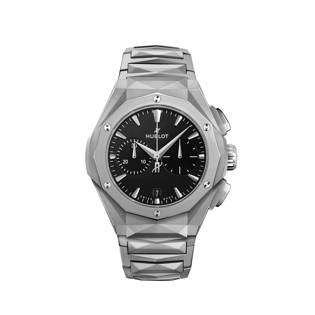 Titanium is extensively used by Hublot, specifically for its lightness. It displays the best relationship between resistance and weight of any material, which makes it an extremely popular material especially within aeronautics. It also stands out with its resistance to corrosion and its inertia in contact with the skin. Hublot only uses high quality, grade 5 titanium, the strongest there is. Once polished, this material retains a slightly bluish metallic sheen.