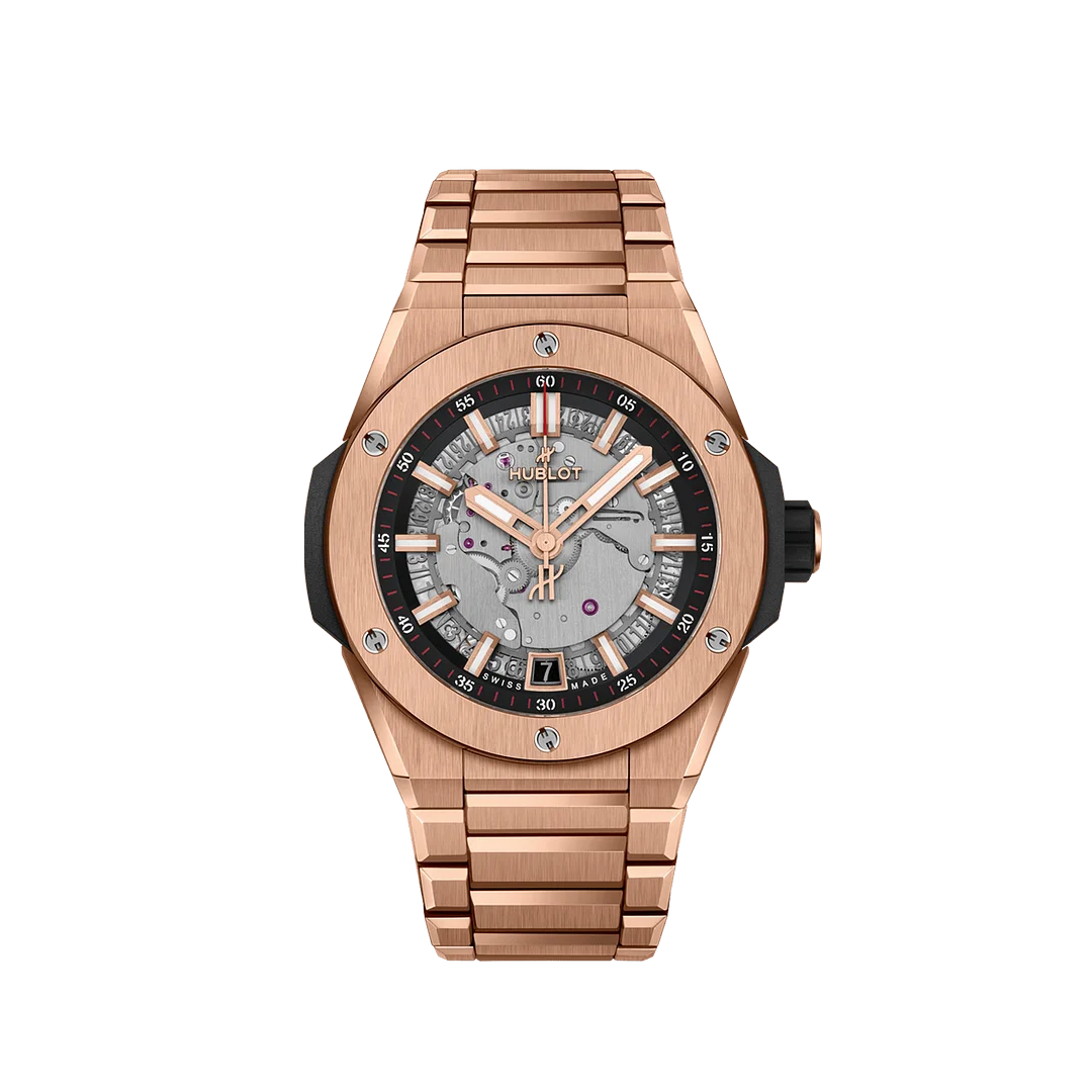 As a master of fusion and an alchemist of precious metals, Hublot has developed a new gold color with a warmer shade than the traditional 5N 18K gold. Containing mainly platinum, this exclusive King Gold alloy perfectly lends itself to all elements of polishing and satin finishing. Hublot watches blend the most unexpected materials like high-tech ceramic, rubber and carbon.
