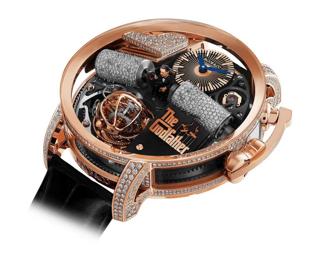 Functions:Hours, Minutes, Gravitational Triple Axis Tourbillon, Godfather Theme activated on demand by pusher at 10 o'clock