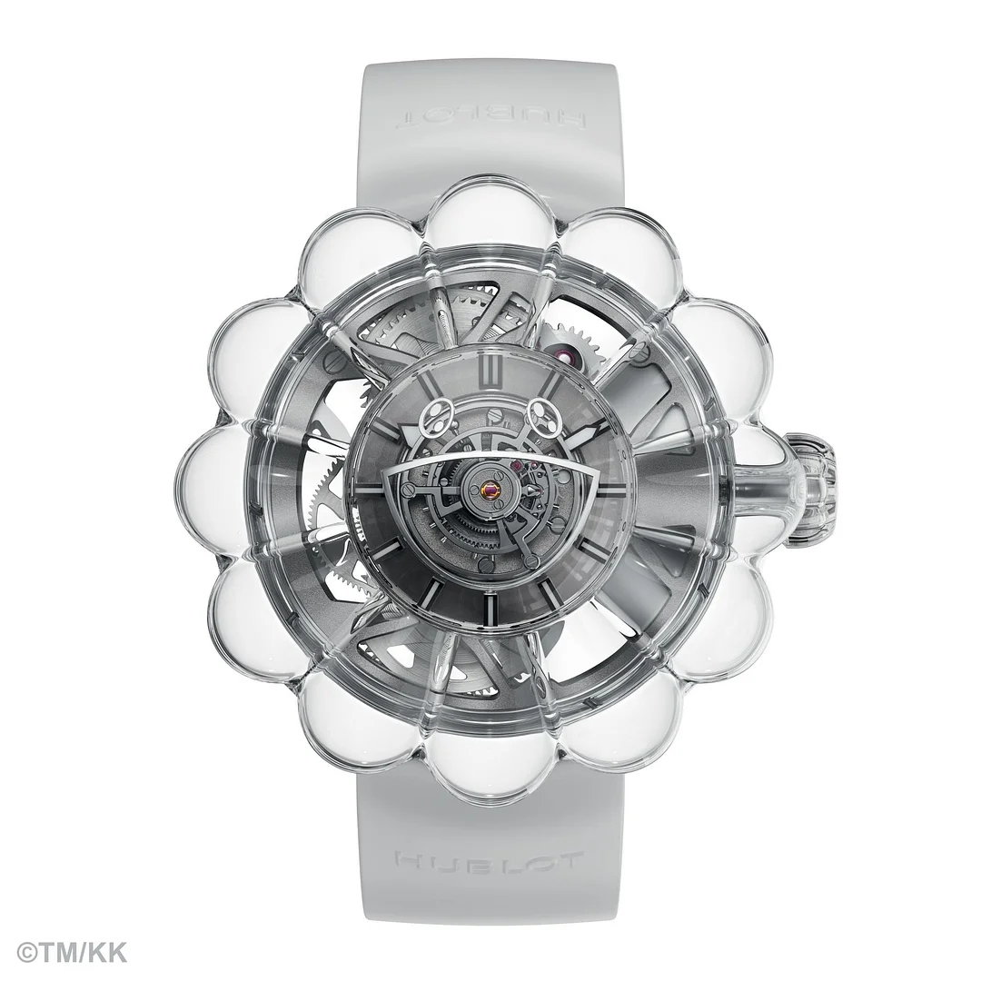 It is surrounded by Takashi Murakami's iconic motif, a flower composed of 12 petals made entirely of sapphire. The flower features soft curves and bold, generous volumes. Hublot's aim was to create absolute transparency in order to maximise the luminosity of the MP-15: sapphire case, sapphire case-back, sapphire crown, translucent flange and strap. The sun will never merely shine on this floral work of art: it will pass straight through it, illuminating its curves and reliefs.