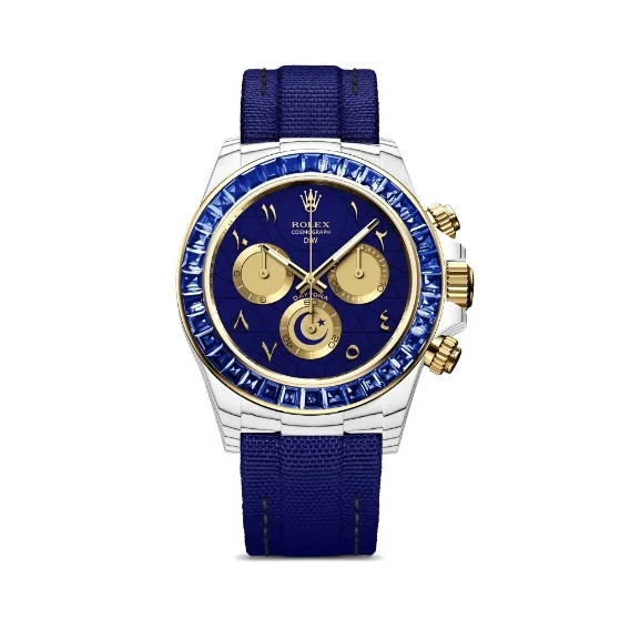 Iris blue, gold, carbon fiber, round, Arabic numerals, chronograph, crystal-decorated bezel, screw-down crown, fabric strap, tactile buckle, mechanical movement. This is a customized Rolex watch by (DiW).