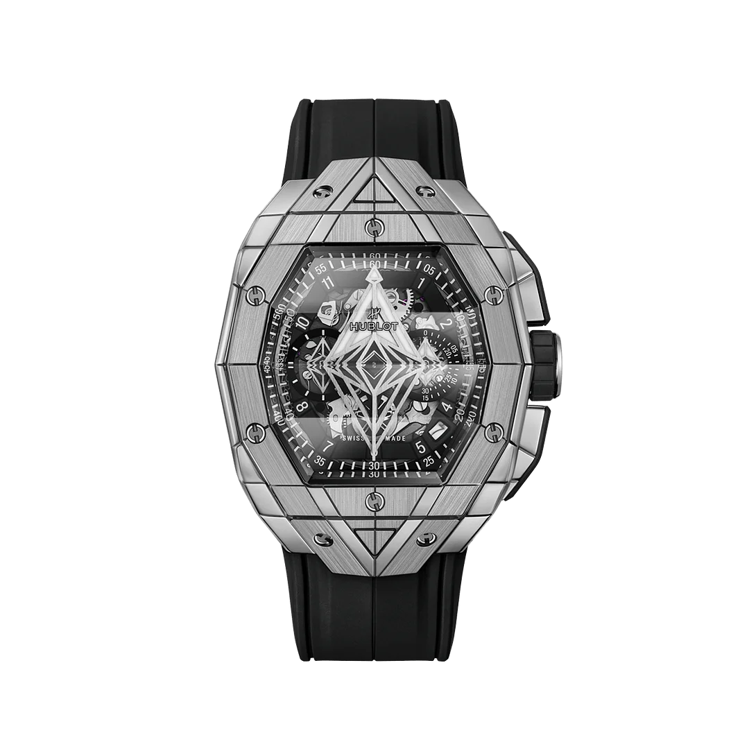 The talented tattoo artist has reimagined the strokes of the Spirit of Big Bang with stretched, elongated bevelled features and measured, perfectly proportioned angles that fit together to create a timepiece where the Sang Bleu signature is instantly recognisable. Like each of his tattoos, the line adapts to the case, to its distinctive characteristics, reliefs, curves, and texture, while retaining what is essential: its spirit. This is the same philosophy that inspired the Spirit of Big Bang.